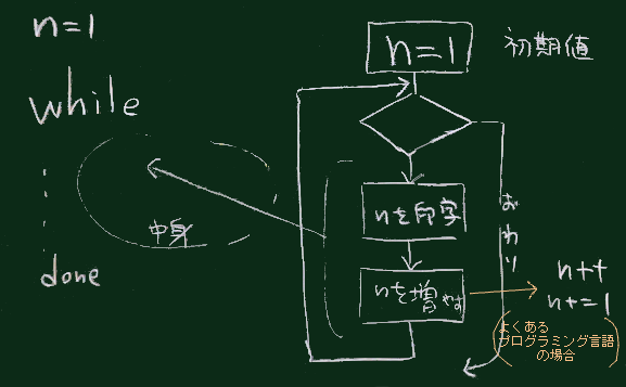 while構文の (マニュアルの表記で) List-1 は、繰り返しの条件判定 を行うためのコマンドを書く場所。
