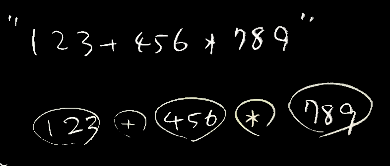 例えば端末から 123+456*789 という式を入力したら、 Rubyの関数 gets は文字列 “123+456*789” を返す。 このままでは式として解析できないので、図のように、 トークンに分解する。数式を構成する数値や演算子が トークンとして扱われる。